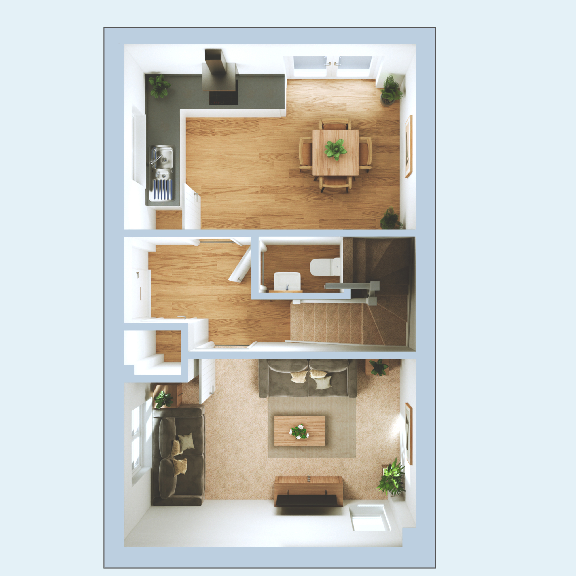 Stepping inside, the hallway creates a welcoming sense of arrival and connects each part of the ground floor. To the front, the living room offers a calm and cosy space – ideal for relaxing or spending time together. To the rear, the kitchen and dining area forms the heart of the home, providing a bright and sociable space for everyday living. With doors opening out to the garden, this area is filled with natural light and creates a seamless link between indoors and out. A convenient downstairs WC and additional storage complete the ground floor, adding to the home’s practicality.